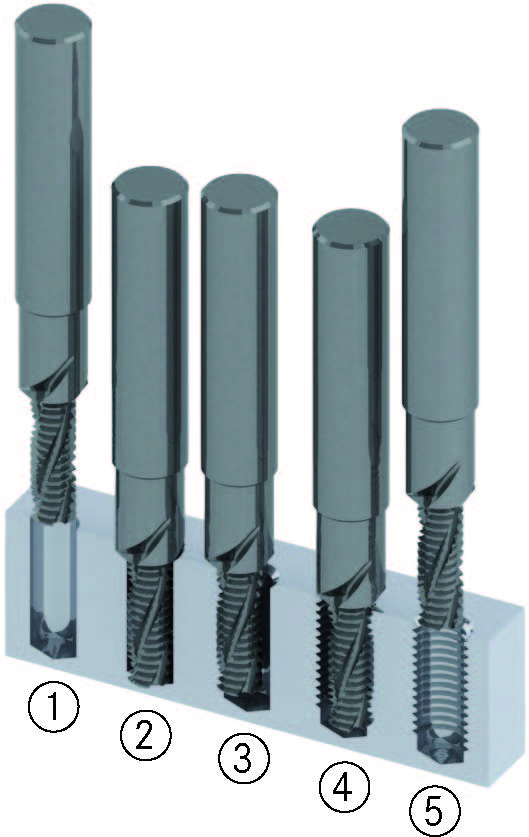 Die Werkzeugzähne des Gewindefräsers sind aufeinanderfolgend angeordnet, ohne eine spiralförmige Steigung zu bilden. Die Gewindesteigung wird stattdessen von einer CNC-Maschine mithilfe der Z-Achse erzeugt. Während des Gewindefräsens entstehen äußerst kleine Späne, wodurch äußerst prozesssicheres Arbeiten ermöglicht wird. Dies ist insbesondere bei hochpreisigen Bauteilen von entscheidendem Vorteil.
